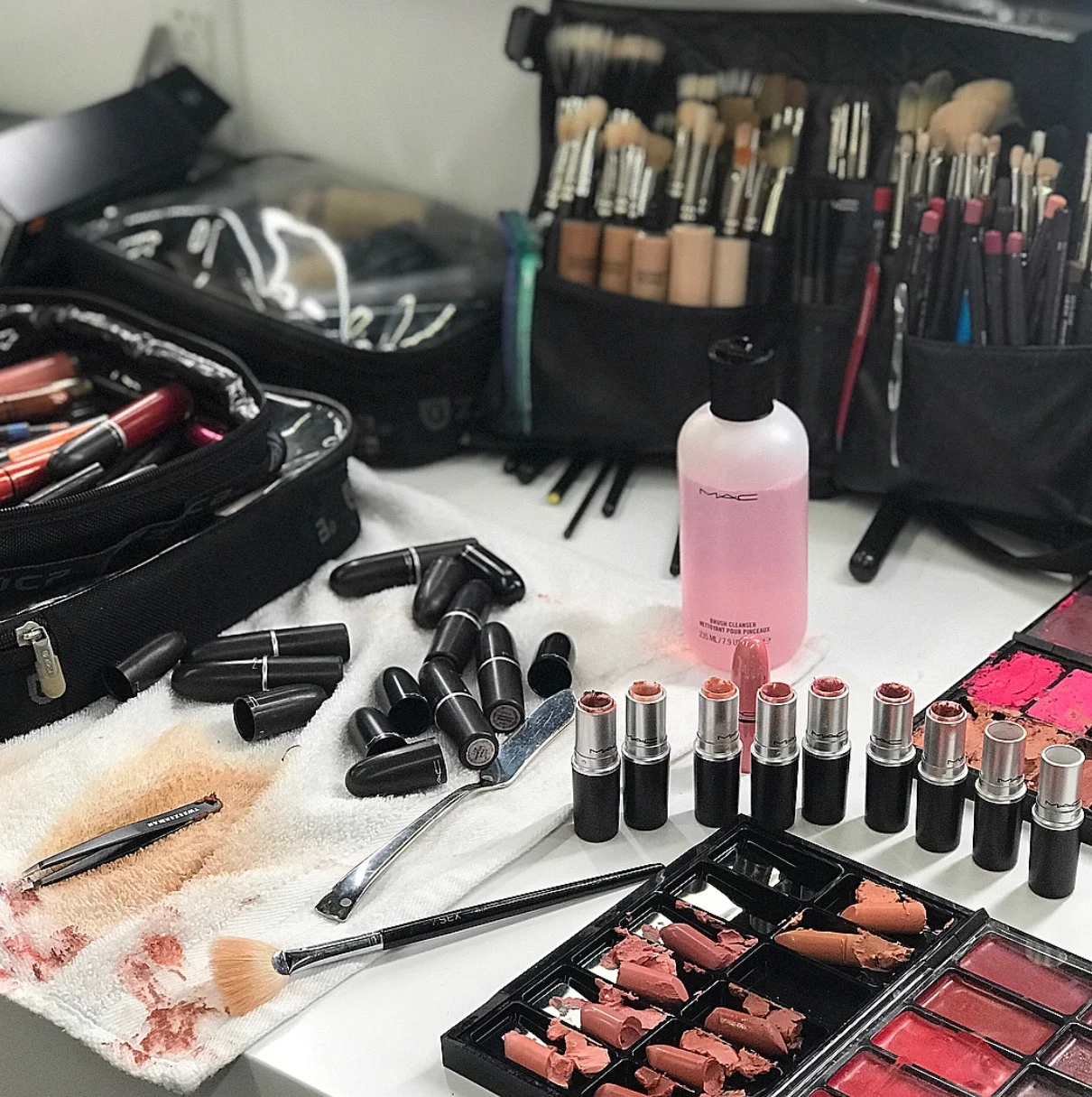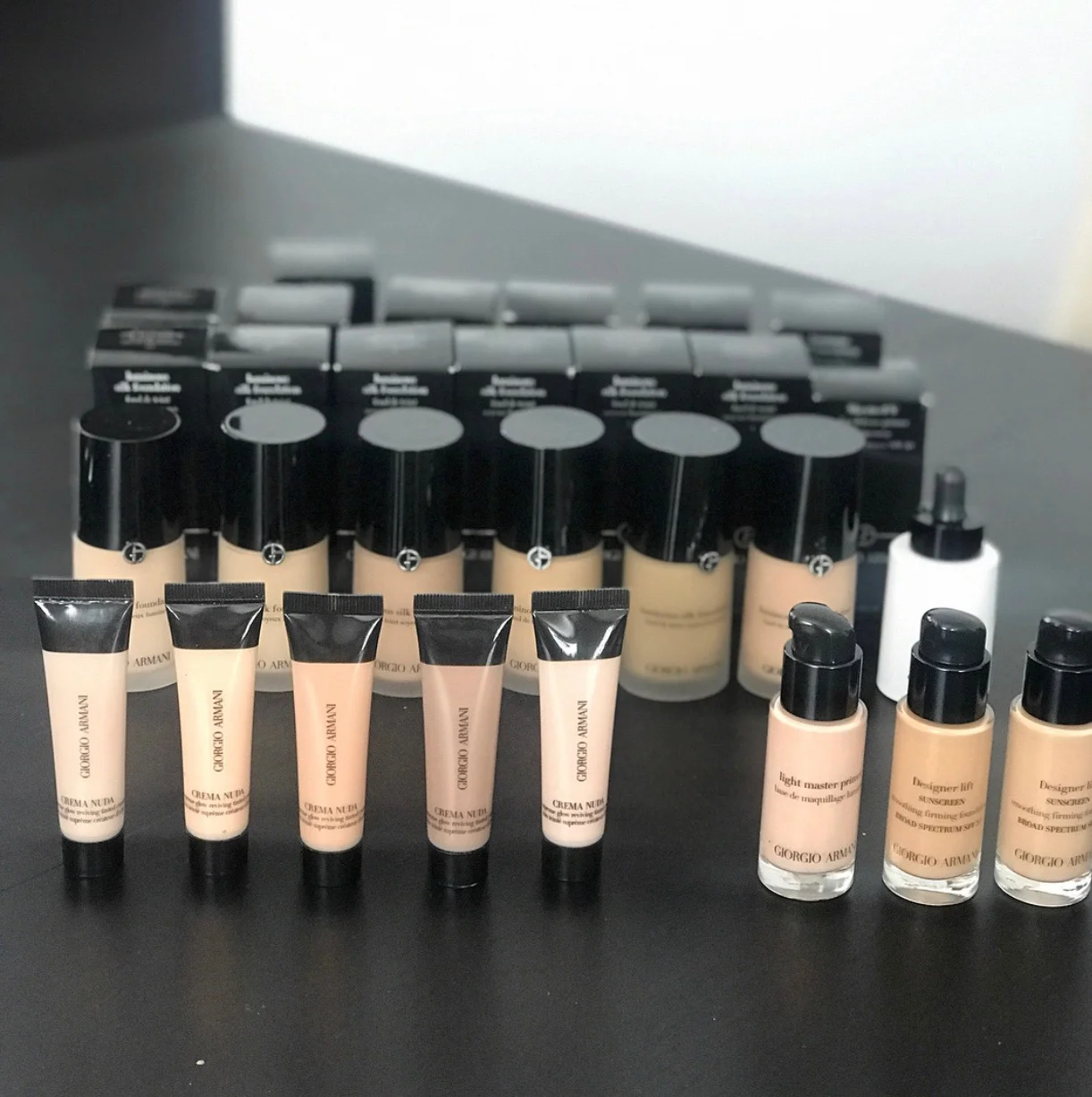 Armani Silk, La Mer, Channel, and Mario foundations, MAC lips, blushes, shadows and brows, Pat McGrath shadows, Becca Setting Powders, Fenty Primer and Highlighters, Natasha Denona shadow pallets, La Mer, Tart Shape Tape and Kiss Individual Lashes.